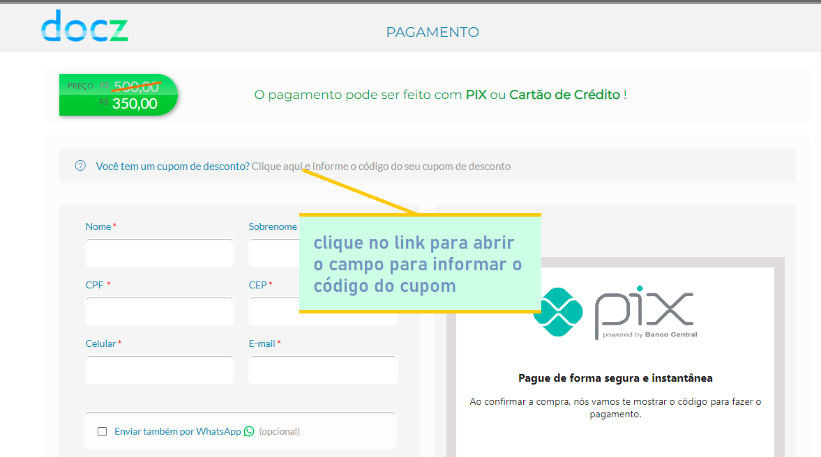 Ao concluir a compra, você receberá um e-mail ou WhatsApp, se assim desejar, com o código de cupom que deverá ser utilizado no momento do pagamento dos documentos que fizer.